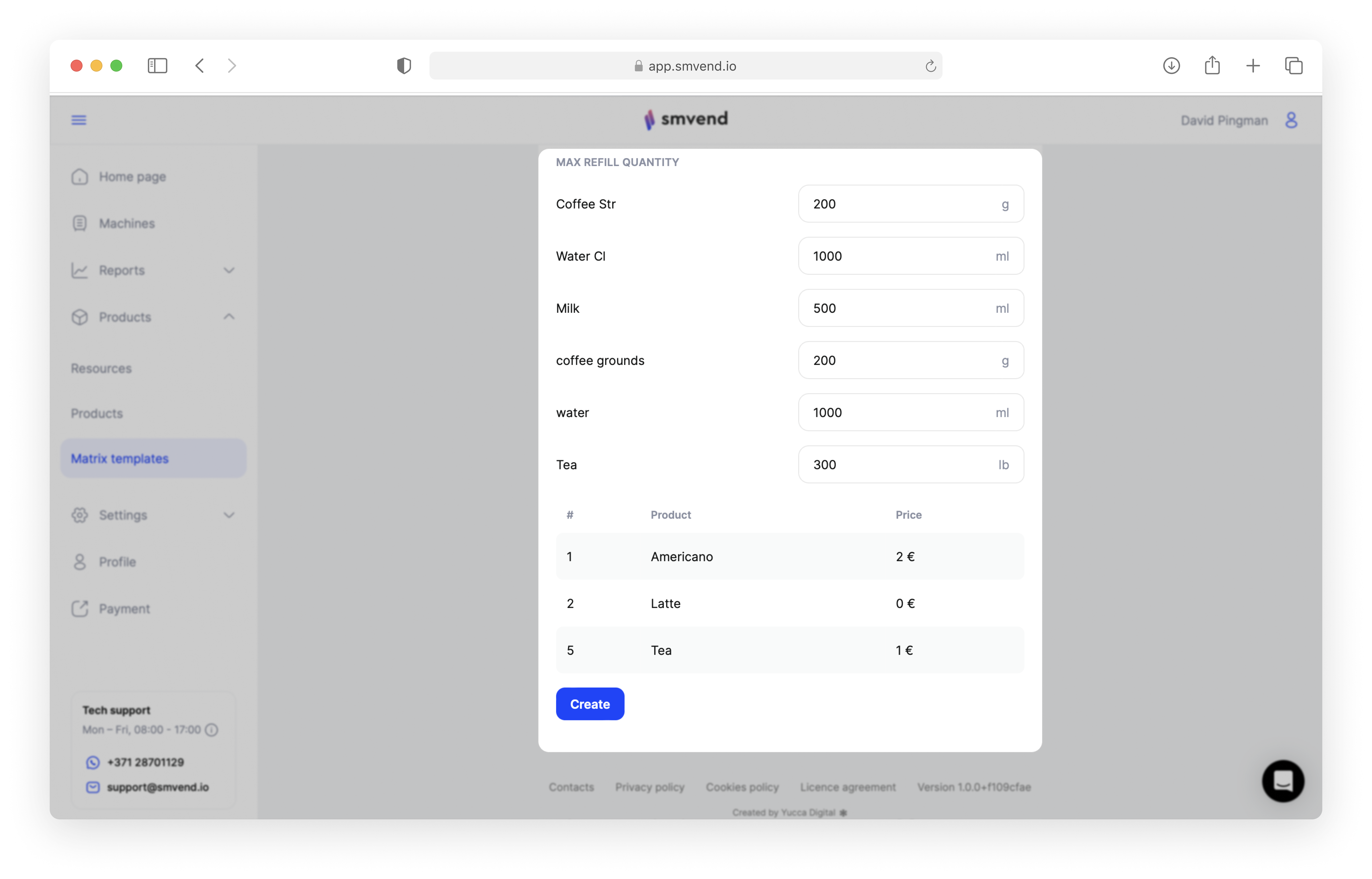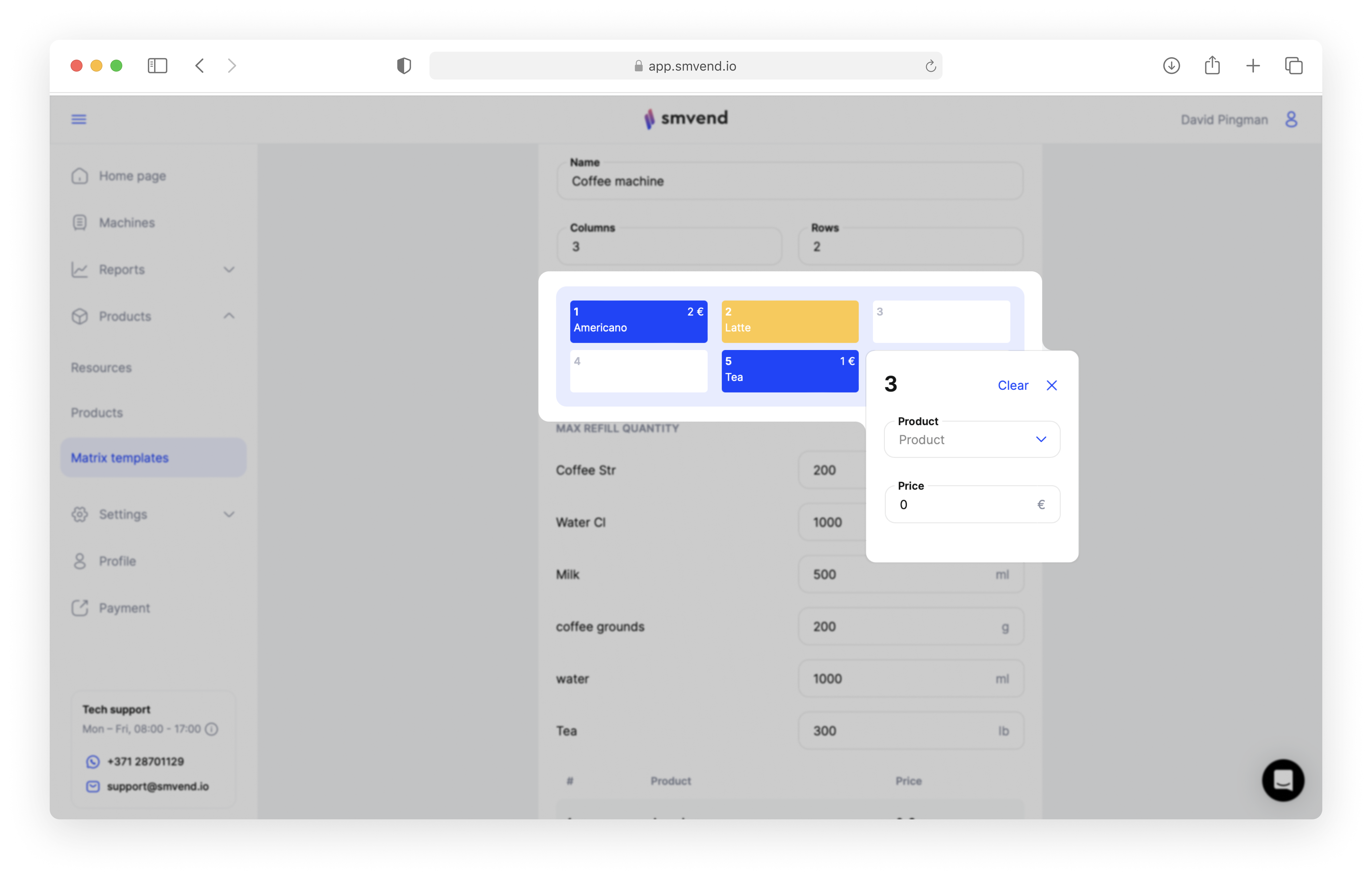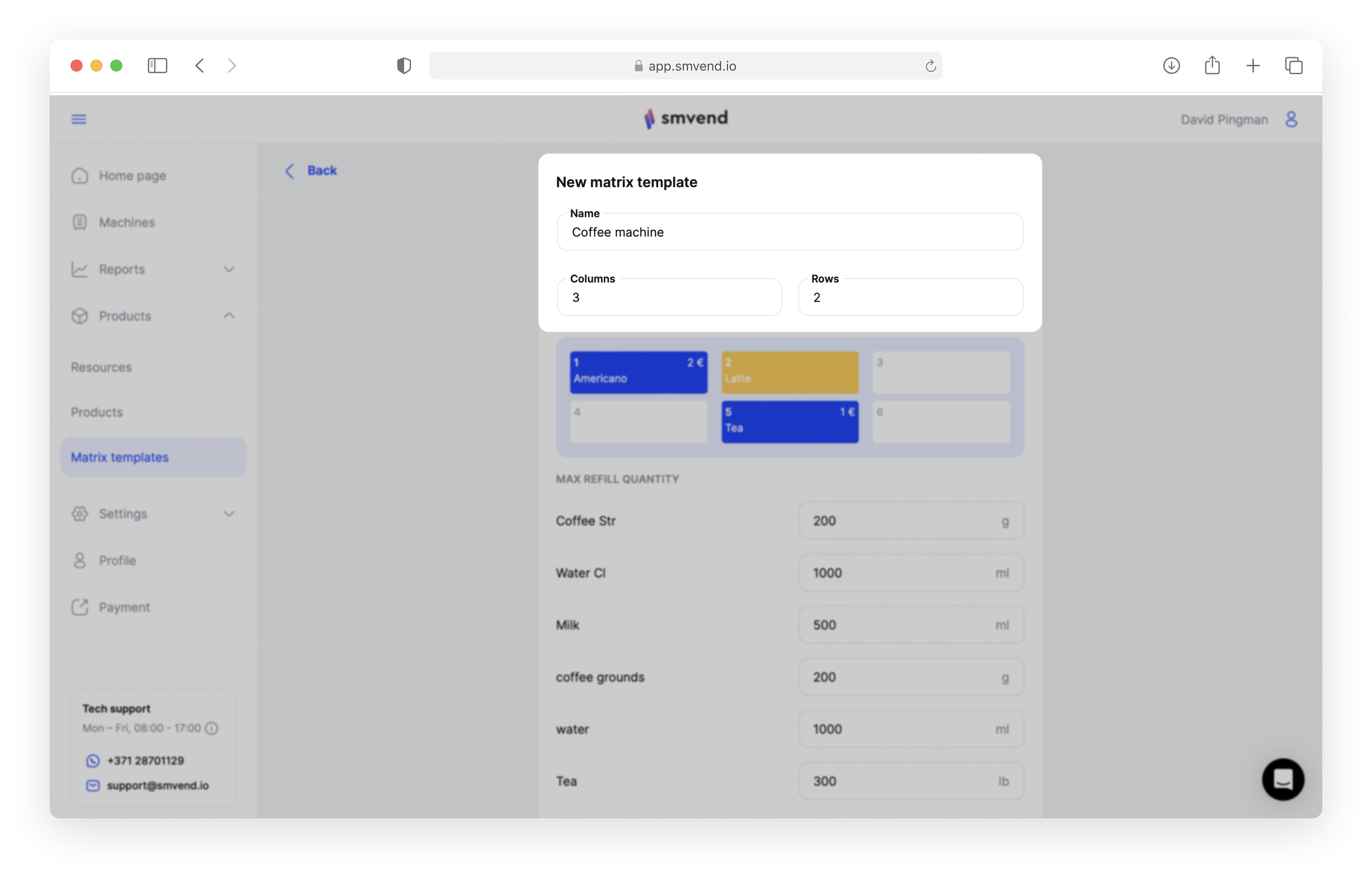 Creating product matrix templates is not a must, but a very useful step if you have several machines with similar products and their prices. With the matrix templates, you can easily fill out product matrices for single machines.