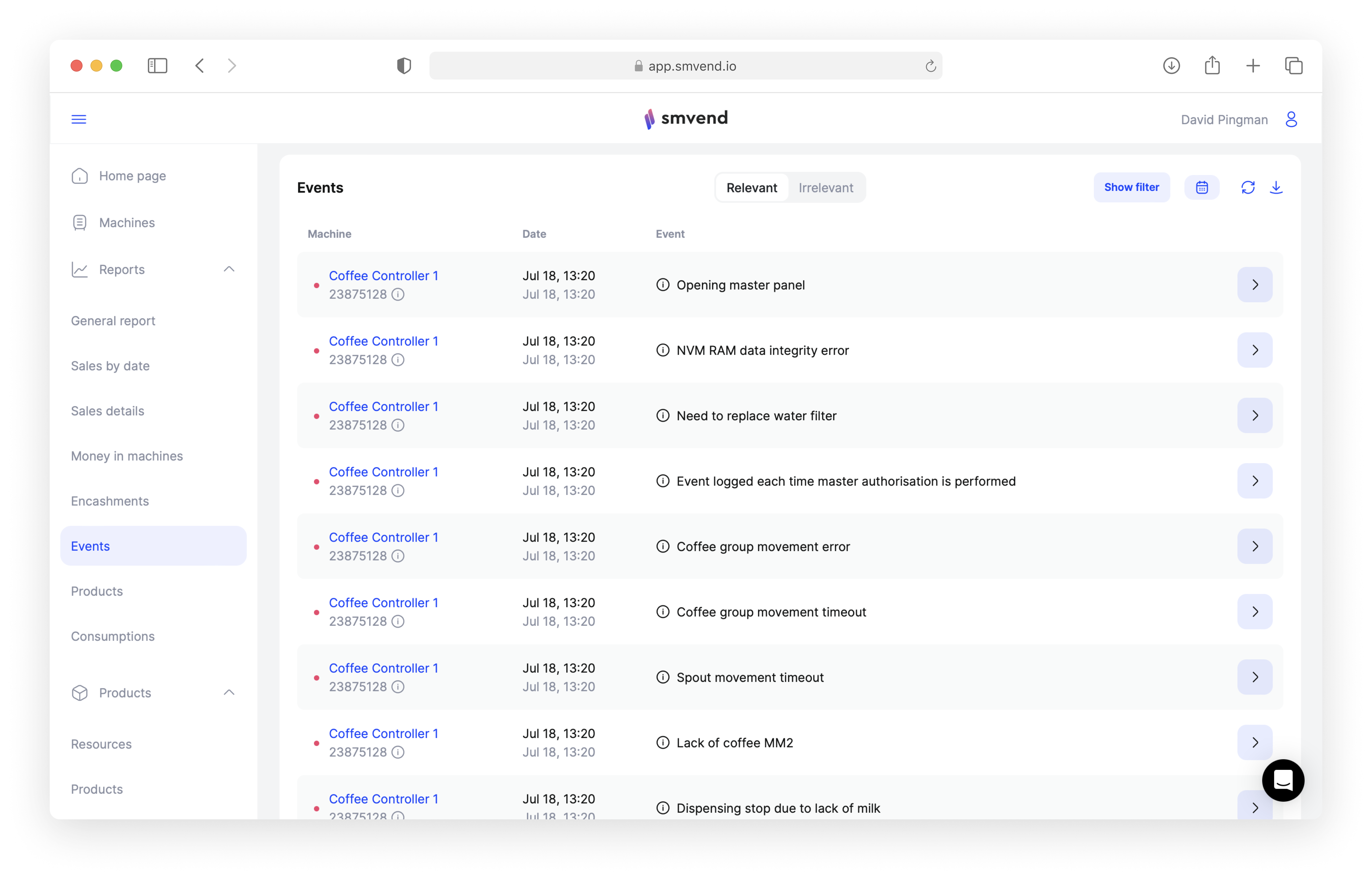 Events show you important updates on the machine’s performance. Once you resolve the issue, you can move the event to irrelevant.